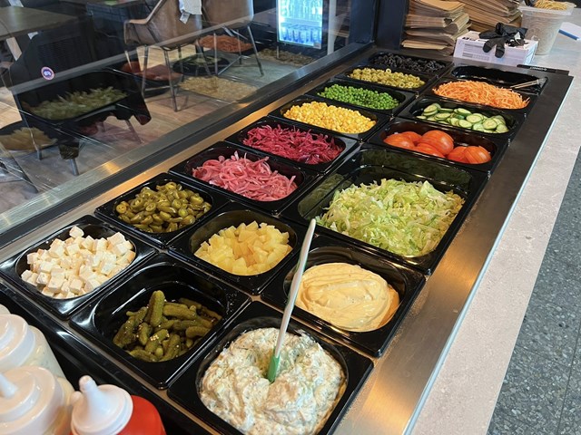 Fyldet består af kylling, bøf og falafel, kombineret med en salatbar med blandt andet syltede rødløg, rødkål og hjemmelavede dressinger. Pita er den mest populære ret – ikke mindst fordi den altid serveres nybagt og frisk.