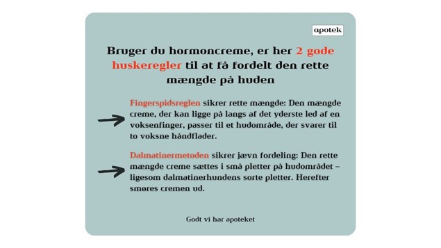 Spørg på apoteket hvis du vil vide mere om hvilken fugtighedscreme, der kunne være god til dig eller du har spørgsmål til brug af hormoncreme. Du kan også se mere på www.lnk.dk/apoteket-dk-hormoncreme