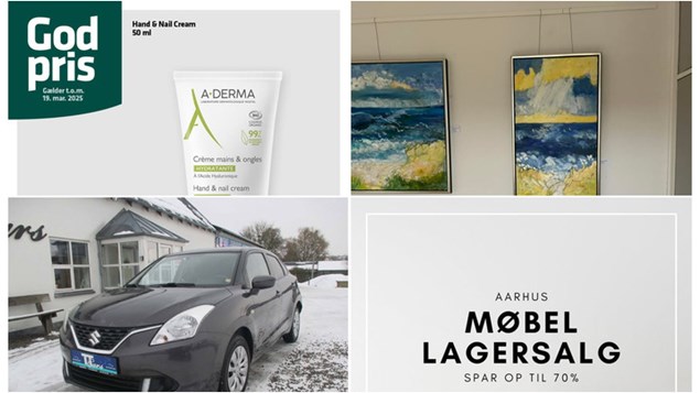 TT Cars inviterer til at se deres udvalg af brugte biler og tilbyder at tage din gamle bil i bytte. Yrsa Dunvad udstiller malerier og kunstbøger i galleri Stigsen i Hornslet den 1. marts. Lagersalg.com annoncerer Aarhus Møbel Lagersalg i Risskov fra 1. marts til april med gode tilbud på møbler fra kendte mærker som Montana og House Doctor. Vejlby Apotek tilbyder en særlig pris på A-Derma Hand & Nail Cream til tørre hænder og negle indtil 19. marts.