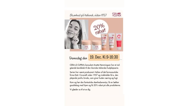 Vi får besøg af CERA di CUPRA’s konsulent Anette Hemmingsen ✨ Tirsdag d.19 December: Vejlby apotek kl.9 - 11:00 Veri apotek kl.12:00 - 14:00 Egå apotek kl. 14:30 - 16:30 Du sparer 20% hele d...