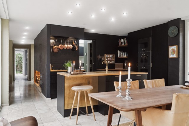 I det åbne køkken i sort eg, finder du det hele - Gaggenaus mest ekslusive serie, vinrum, Quooker samt kalkfrit vandsystem inde og ude. Dinesen-gulvene skaber en lækker finish i boligen, hvor lyset er prioriteret gennem markante glaspartier.