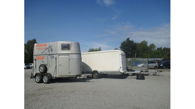 Vi har en hestetrailer med plads til 2 heste og nogle flytte trailere.