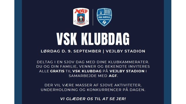 På lørdag d. 9 september kl. 12-15 på Vejlby Stadion holder VSK Aarhus klubdag i samarbejde med AGF – og alle er velkomne.